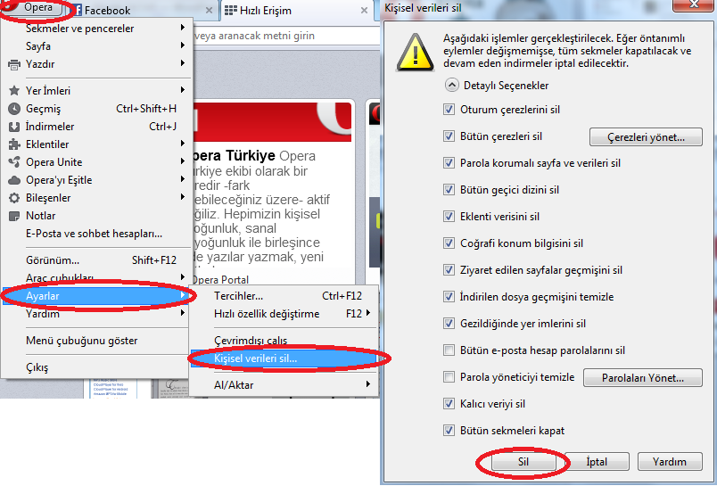 Opera tarayıcısında önbelleği temizlemek için Araçlar > Ayarlar > Kişisel verileri sil bölümüne giriş yapabilirsiniz.